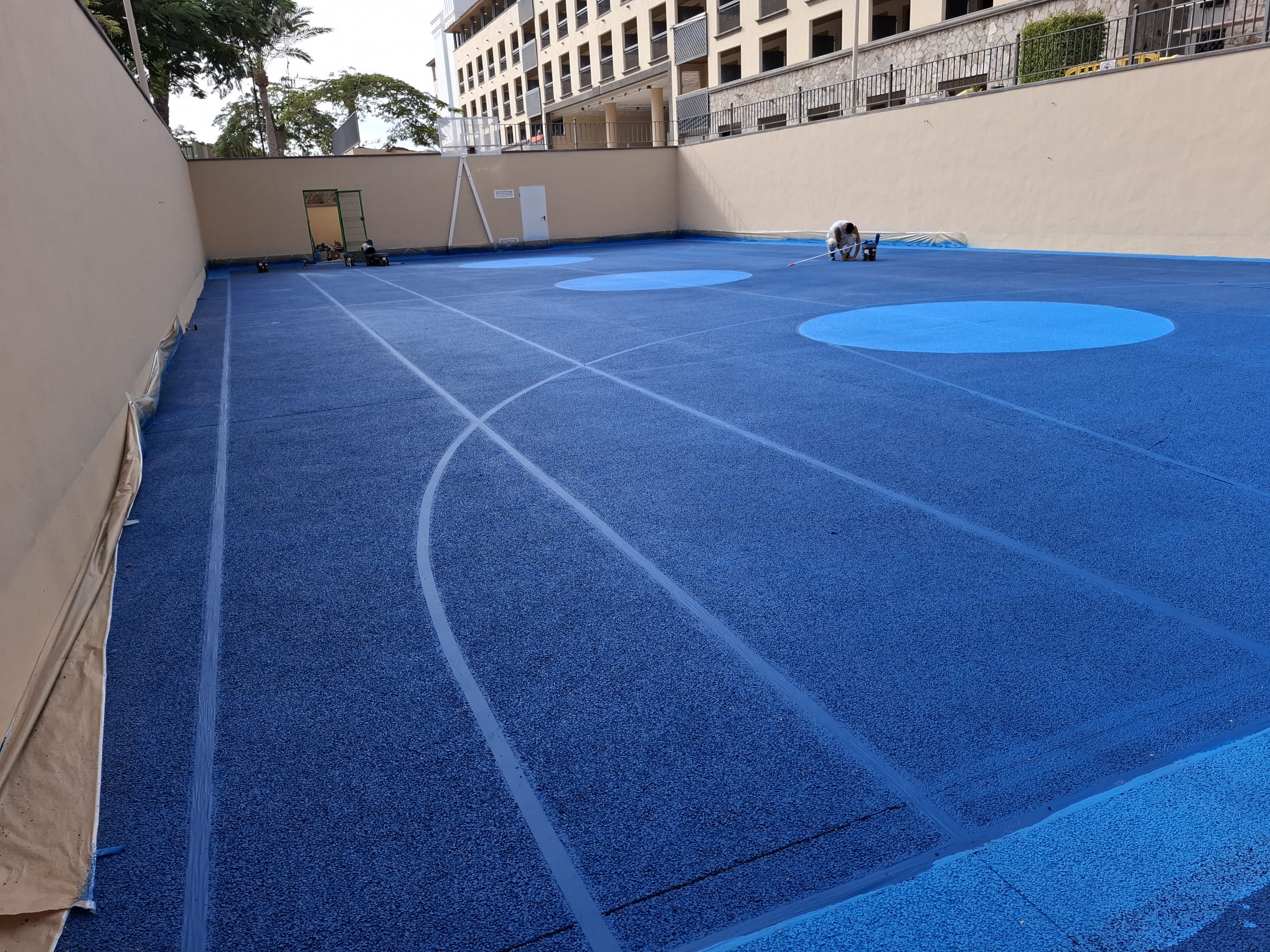 Previa preparación de la superficie, Aplicación de Imprimación con el mismo producto diluído al 25% y dos manos de Acabado con Pintura Acrílica específica para Canchas deportivas, antideslizante. Colores RAL 5017 y 5012 e Incluso encintado y repintado de marcaje de zonas en color Blanco.