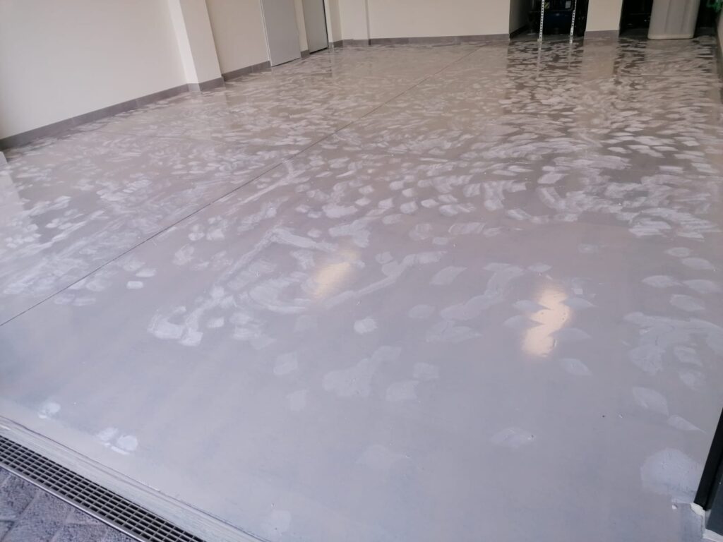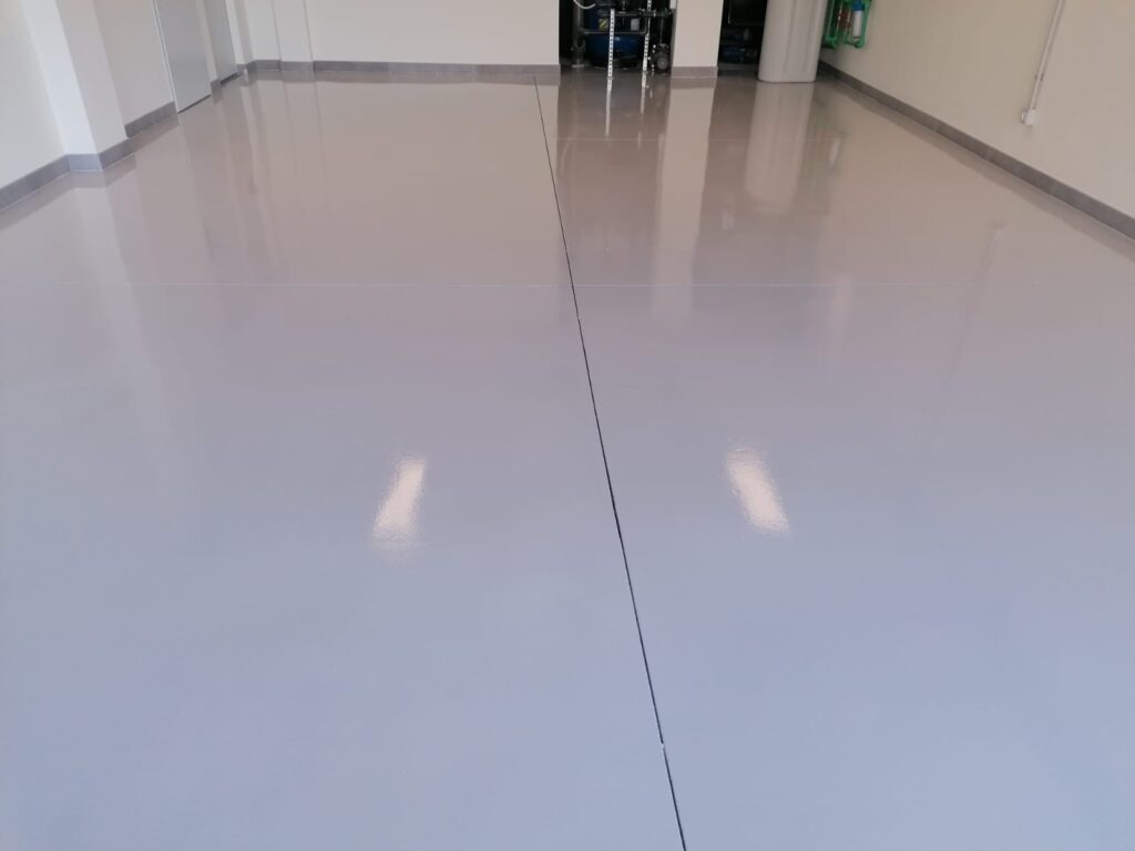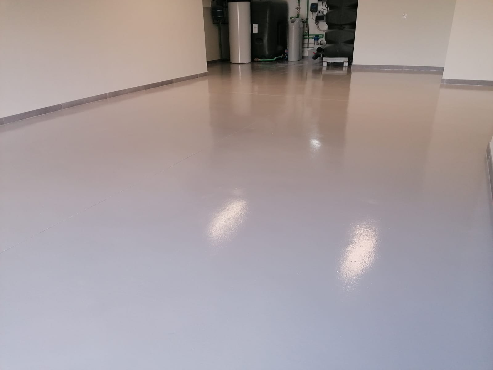 Imprimación epoxi 100% Sólidos transparente 2 componentes aplicado a llana para el buen anclaje y dos manos de acabado con poliuretano alifático 2 componentes, color Gris Estandar.